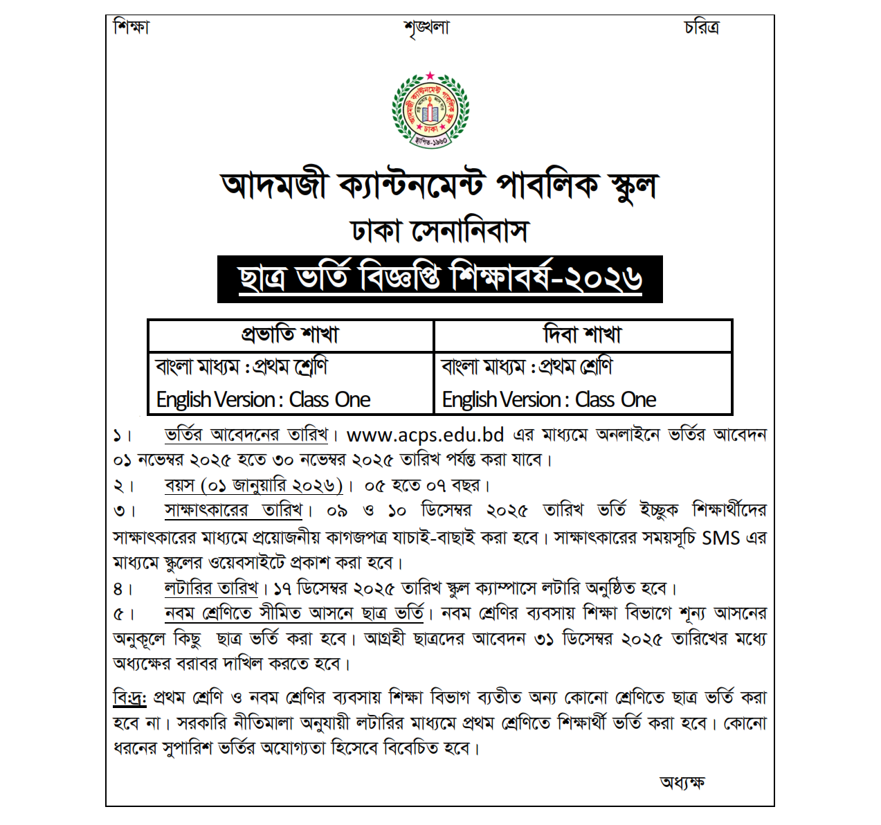 Adamjee Cantonment School Admission Circular 2026. ACC HSC Admission Circular 2025-26. Adamjee Cantonment Public School Class 1 Admission Result 2026. ACPS Class one admission notice 2025 has published. Adamjee Cantonment College Dhaka Admission lottery result 2026. HSC Admission Application Process. Bangla and English version. Adamjee Cantonment Public School Class 1, Class 6, Class 9 admission process has begin. ACPS admission application will open on November 1, 2025. Class one application last date November 30, 2025. Students can download application form from www.acps.edu.bd web site. Dhaka Adamjee School & College admission lottery result will publish December 2025.