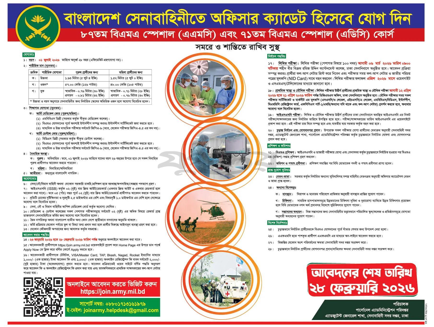 97 BMA Long Course Circular 2026. Bangladesh Army Officer Circular 2026. 97 BMA Long Course Written Exam Result. Junior Commission Officer job circular 2026. Bangladesh Army Officer Cadet Circular 2026. BMA Long Course Recruitment Circular 2026. Bangladesh army circular 2026 for cadet officer. HSC Applicants 2026 can apply for this post. 96th Bach Officer Cadet recruitment is going on. Join Bangladesh Army web site has post detail circular. Army BMA Long Course job application start January 5, 2026. Officer cadet 1st Group job application last date March 14, 2026. Candidate age have 16.5 to 21 years by 1st January, 2026. Graduate application are eligible for BMA special course like engineering core, Medical core, education. Short course also available for degree/honors pass applicants. BMA Special Circular for Engineers, Singlas, EME and AEC.