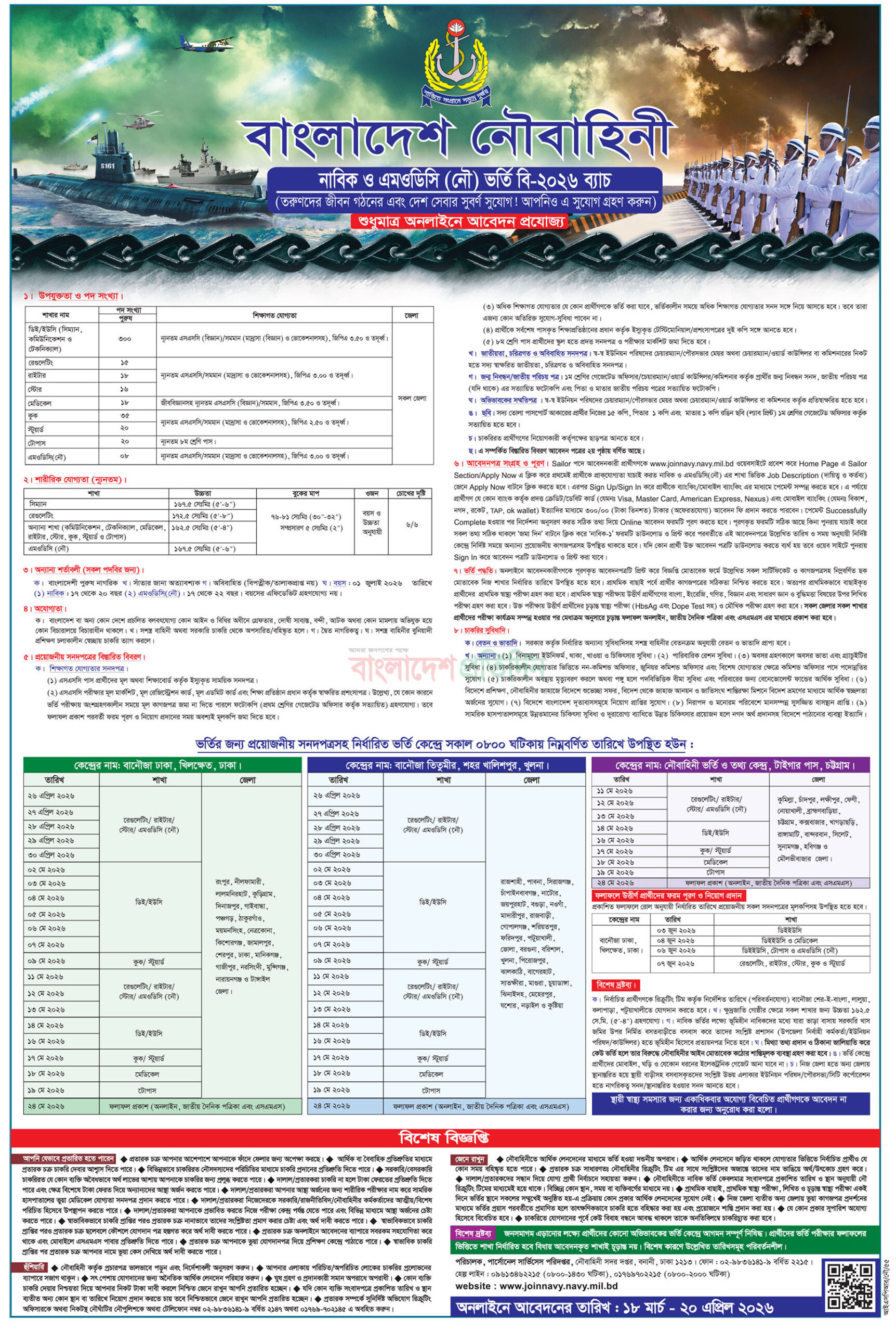 Bangladesh NAVY Job Circular 2026. Bangladesh Navy Sailor and MODC Circular 2026. Navy Civil Job Circular 2026. www.joinnavy.mil.bd-sailors section recruitment. Join Bangladesh Navy as sailor. NAVY Officer Cadet Job application last date April 20, 2026. BD Navy Nabik and MODC primary selection will be started on April 2026. Primary selection will be held at Dhaka, Khulna and Chittagong. District wise selection center on efferent date time. SSC, Dakhil or equivalent pass candidate can apply for various post. Applicants age not over 17-2o years as on 1st July, 2026. Sailor and MODC selection result 2026