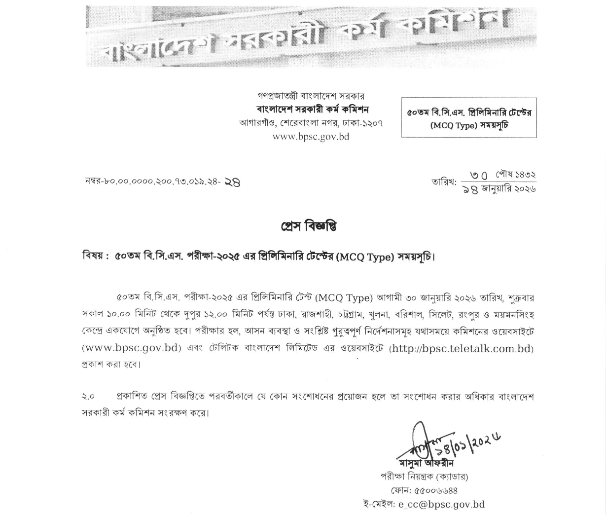 50th BCS Preliminary (MCQ) Exam Date 2026