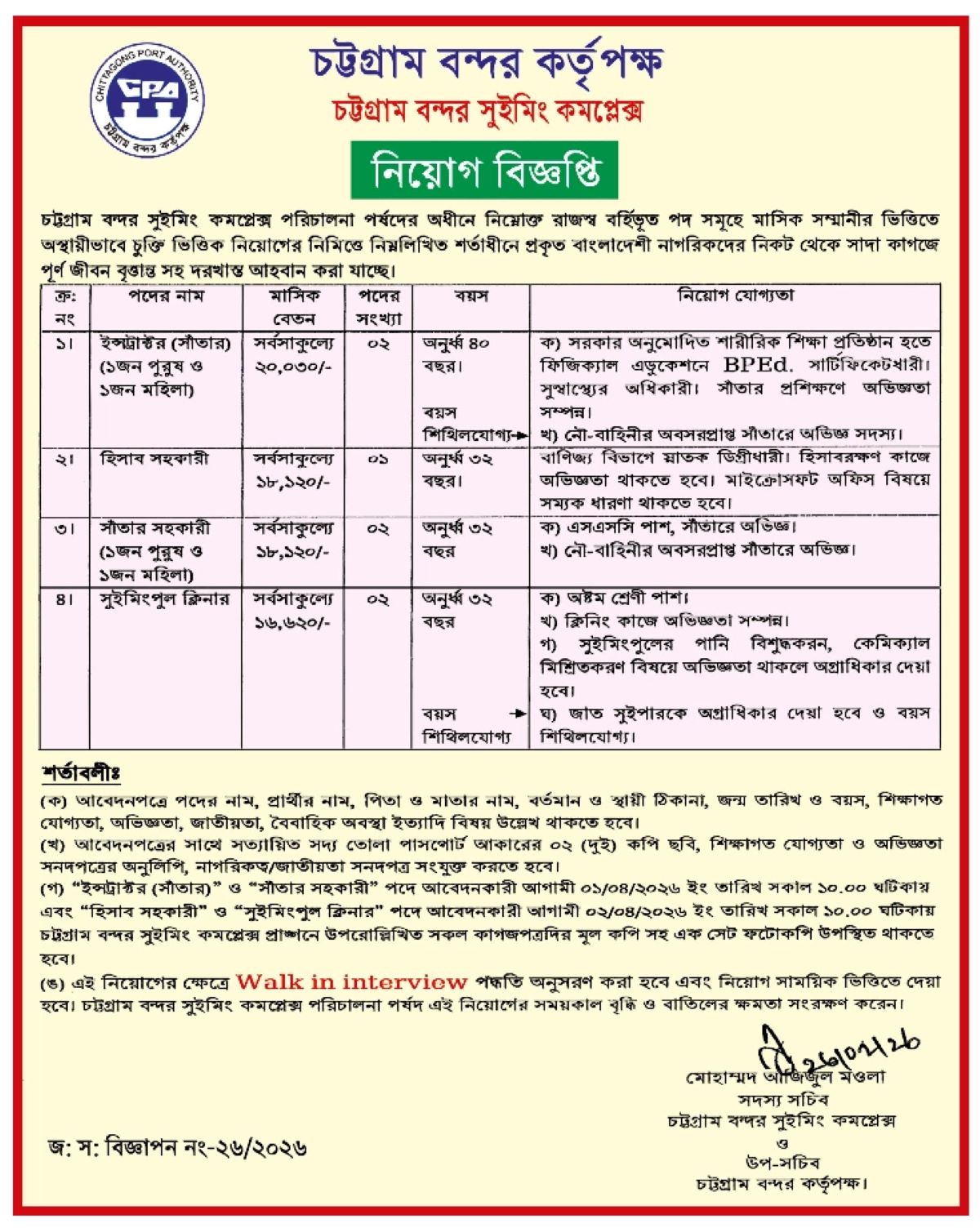 Chittagong Port Job Circular 2026. Chittagong Port Authority Job Circular 2026. Port Authority Recruitment Circular 2026. চট্টগ্রাম বন্দর কর্তৃপক্ষ নিয়োগ বিজ্ঞপ্তি. www.cpa.gov.bd job circular 2025. Chittagong Port Exam Result 2026. Port authority will recruit 660 employee as permanent. Chittagong Port Authority career for Bangladeshi citizen. They will recruit for various post and qualification is different for each post. Chittagong Port Authority Job application last date June 16, 2025. www.cpa.gov.bd online application form. Exam Date November 6, 2025