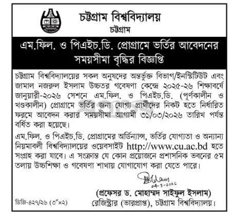 Chittagong University MPhil Admission Circular 2026. Chittagong University PhD Admission Circular 2026. University of Chittagong MPhil & PhD program Admission application form. Students can apply for MPhil & PhD with scholarship or without scholarship. Chittagong University MPhil & PhD admission application last date March 31, 2026. Service holder applicants have to apply through proper channel. MPhil & PhD students have to work min 1 year full time researcher.
