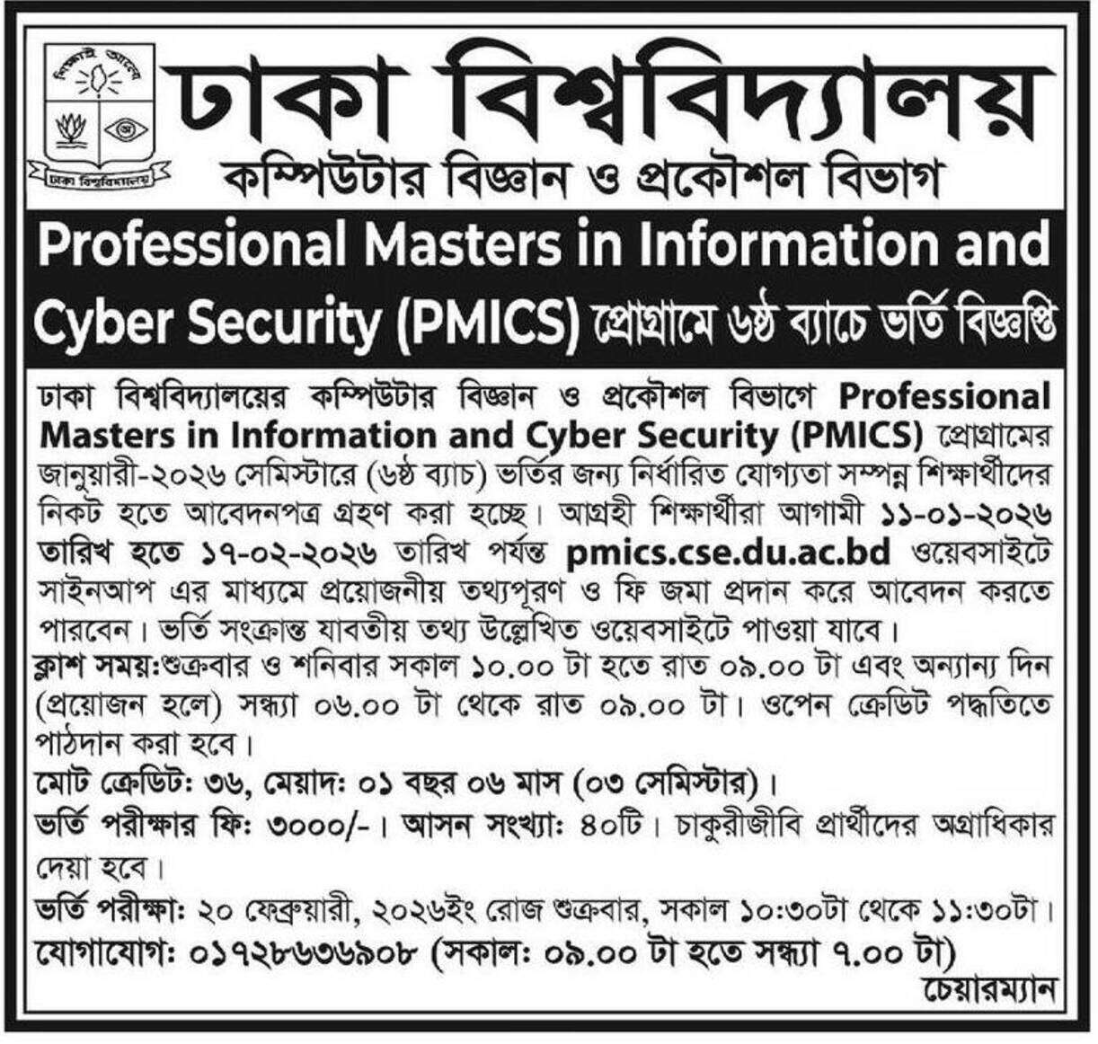 Dhaka University Masters in Cyber Security Admission Circular 2026