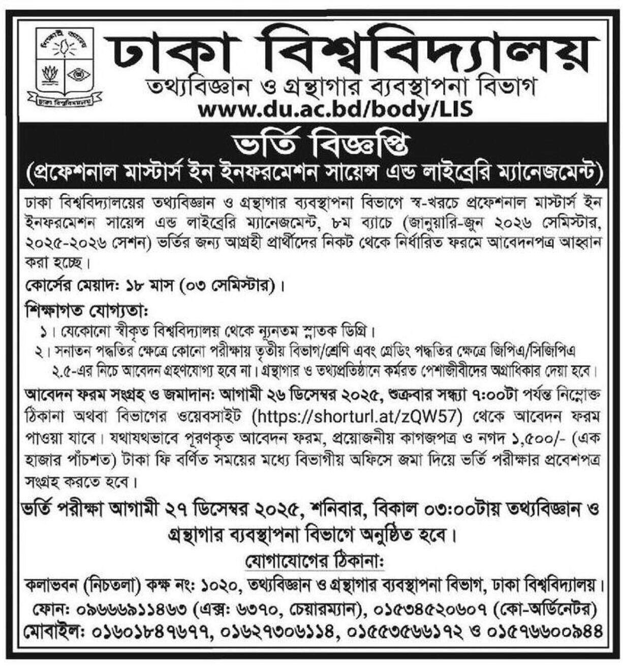 Dhaka University Masters in Masters in Professional Banking admission test circular. MPB admission application last date December 10, 2025. Masters in banking admission test will be held on December 12, 2025