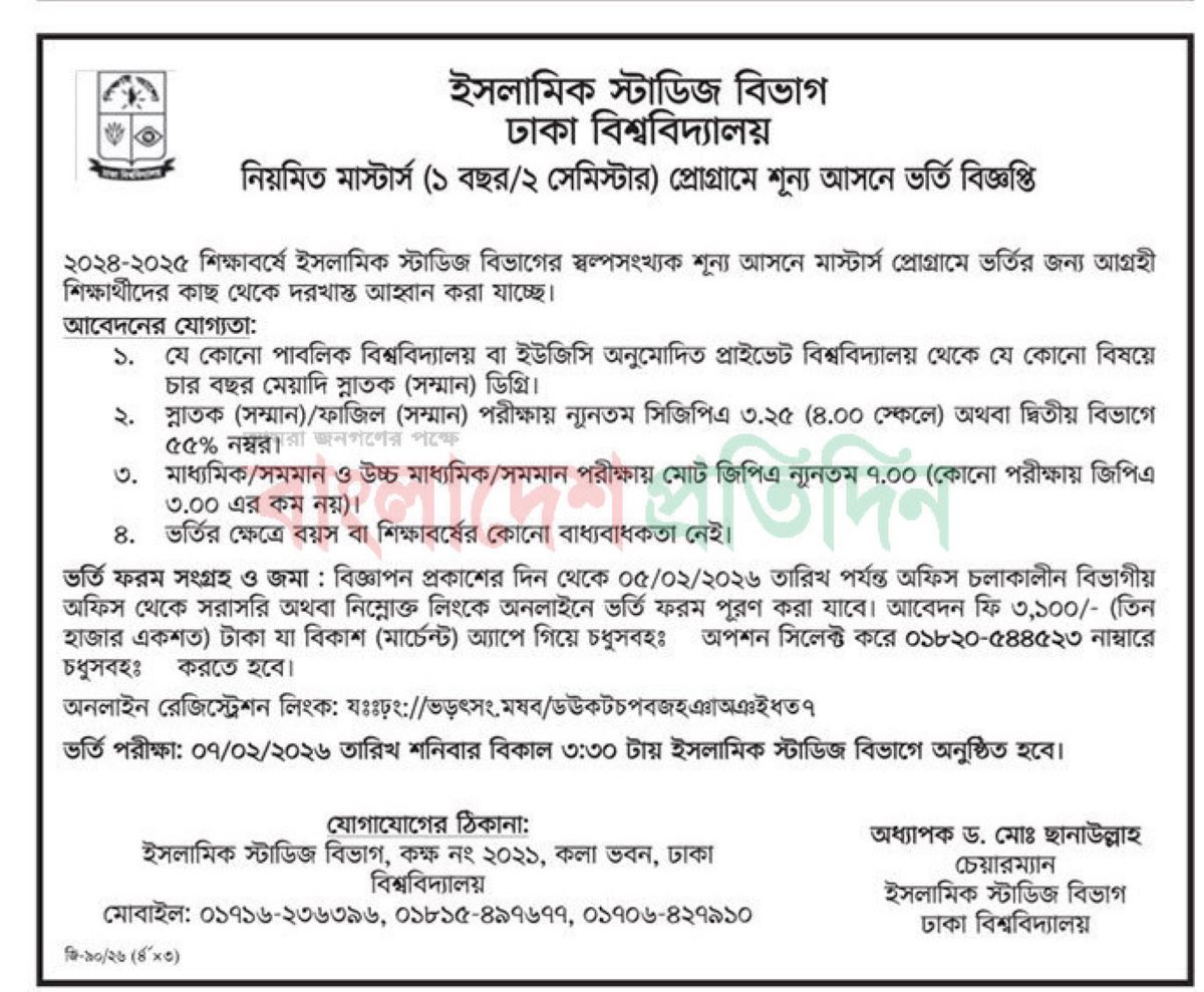 Dhaka University Masters Admission Circular 2026. Postgraduate Admission in Dhaka University. DU Masters Admission 2025-26. Dhaka University Evening Masters Admission 2026. Masters in Banking, Accounting, Finance, Marketing Admission Result. DU Masters Admission Result. Masters Admission Test Result. Dhaka University Masters admission application last date. Masters admission test date and seat plan. Applicants have to collect application form from respected department. Department wise vary application fee. Course fee also depend on department. Masters admission Test question download.