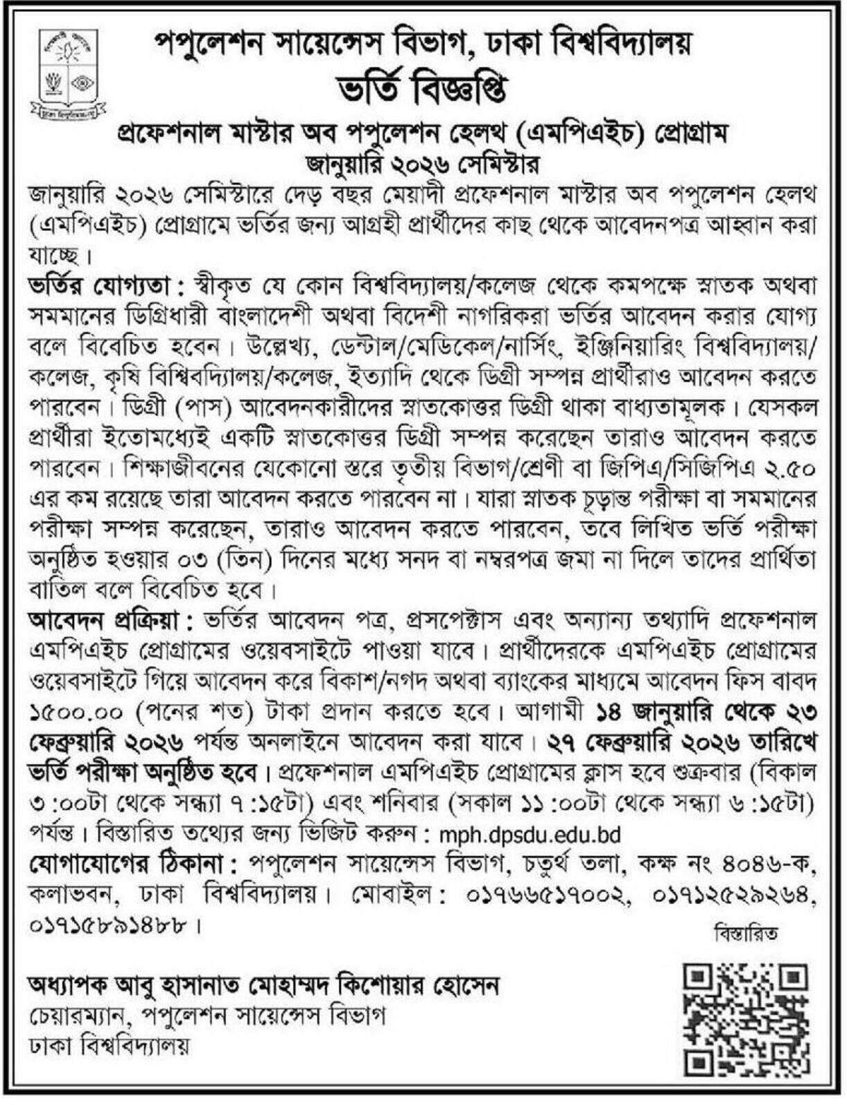 Dhaka University Masters in Population Health Admission Circular 2026