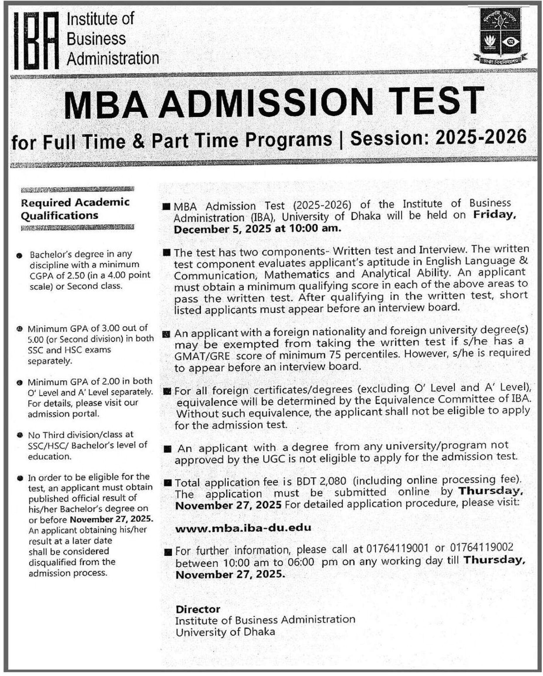 Dhaka University IBA MBA Admission Circular 2025-26. IBA MBA Admission Result 2025. DU IBA MBA Admission notice 2025-26. IBA MBA Full Time & Part Time program admission application is going on. Institute of Business Administration under Dhaka University. IBA MBA online application last date November 27, 2025. Eligible applicants must submit their application within deadline. Application fee Tk. 1000/= only for each applicant and payment should be made by Bank Draft/Pay Order in favor of IBA, Executive MBA. Students can download Application form IBA web www.iba-du.edu site and it will be submitted to Executive MBA program office.