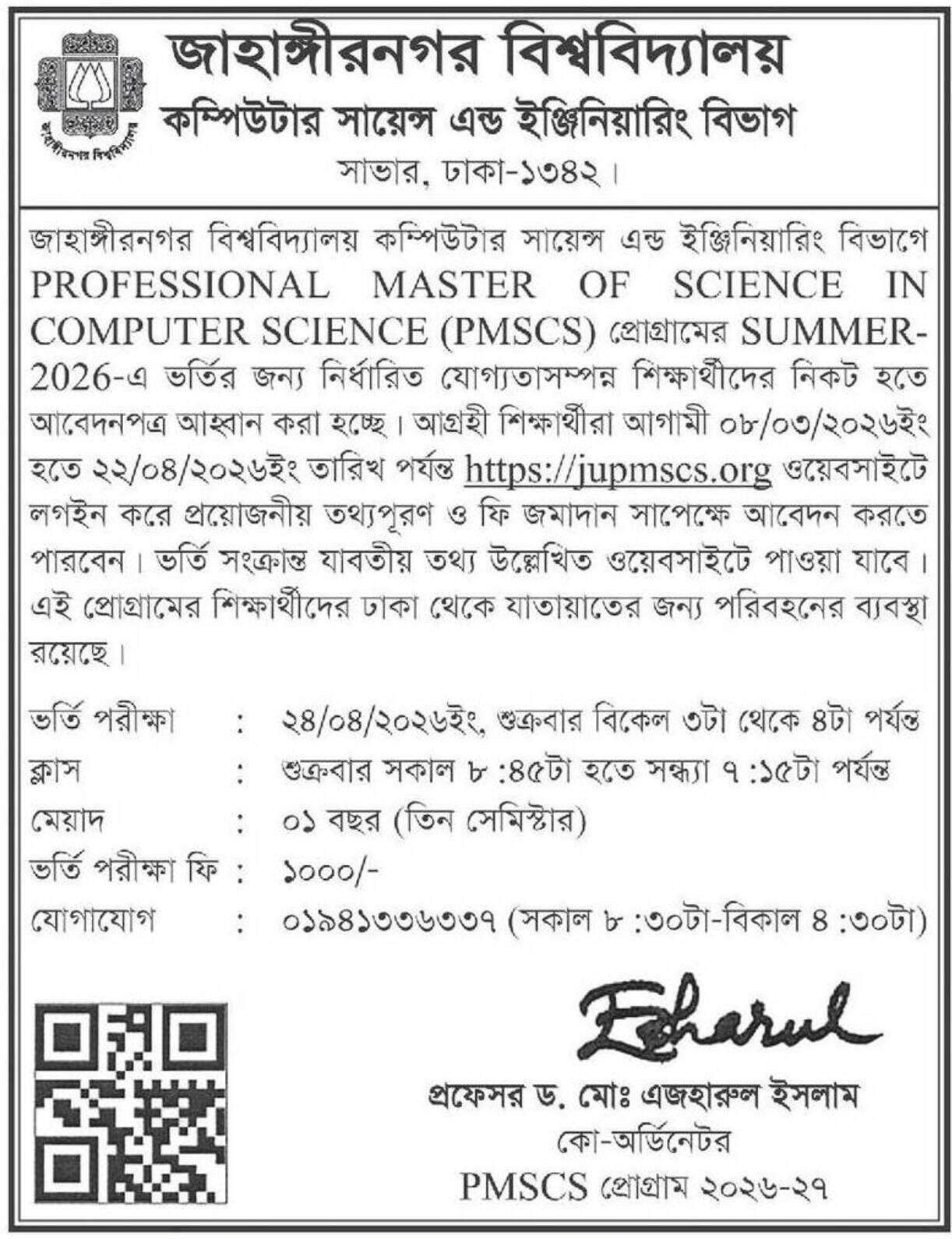 Jahangirnagar University Masters Admission Circular 2026. JU Evening Masters Admission 2026. Jahangirnagar University weekend Masters in English, Computer Science, Economics, Information Technology admission circular 2026. Masters admission Test Result. JU Evening Masters in CSE or CS for session 2026. EMCS admission exam & result information. JU providing EMCS program for Evening Masters in Science. Students have to collect admission application form and prospectus from JU campus for offline application. Application last date April 22, 2026. They can apply online by www.juniv.edu/cse/application-form/ web site. Admission application fee Tk. 1000/= only which must be pay through Dutch Bangla Mobile Bank.