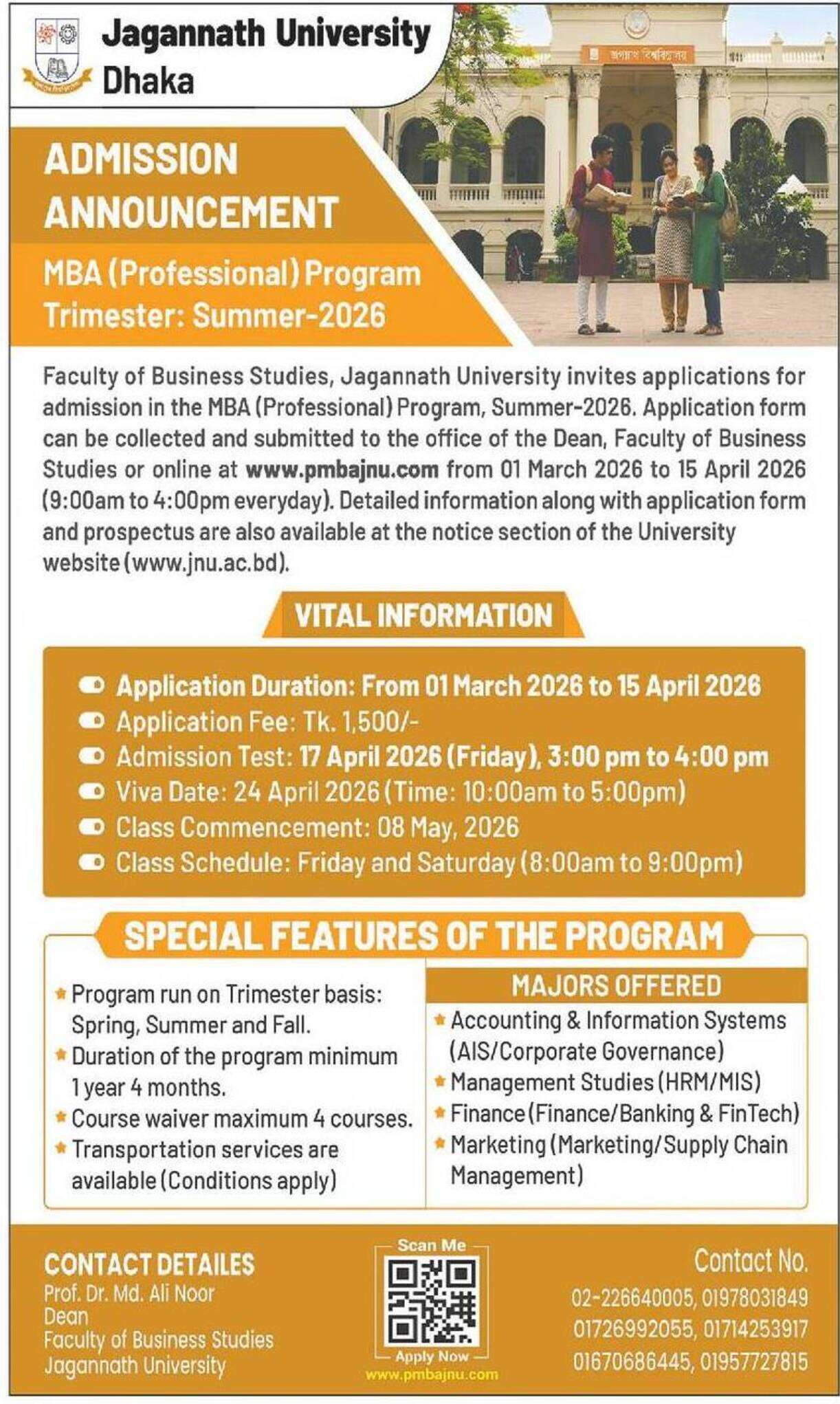 Jagannath University MBA Admission Circular 2026. JNU EMBA admission Result 2026. JNU EMBA Admission Notice 2026. Jagannath University Professional MBA Admission test seat plan 2026. Jagannath University Business Faculty has invited application from fresh graduate or service holder. EMBA application start from March 1, 2026. JNU Evening MBA application last date April 15 2026. JNU EMA admission test will be held on April 17, 2026. Students can collect application form from university and they can download application form online. EMBA admit card and seat plan will publish later.