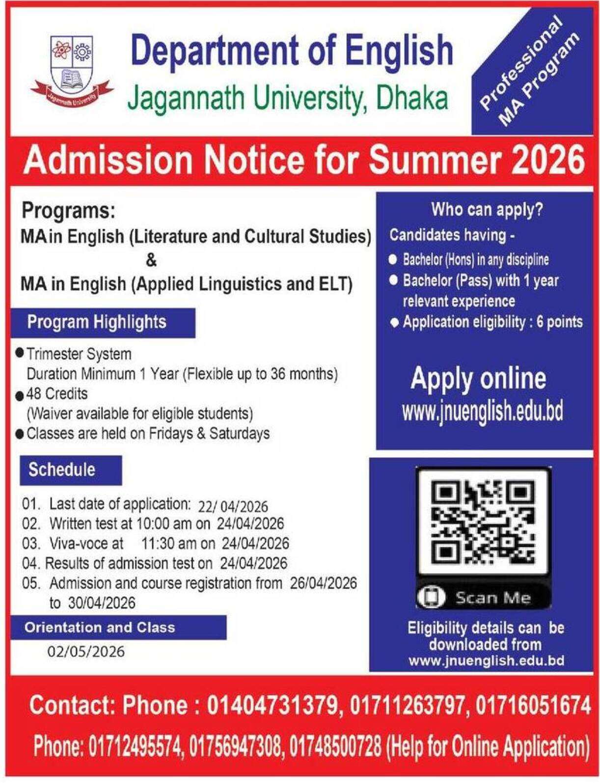 Jagannath University Masters Admission Circular 2026. Jagannath University Evening Masters Admission 2026. JNU Masters in English, HR, LLM, CSE, Mathematics, Islamic Studies Admission notice 2026. Evening Masters Admission in Jagannath University. JNU Admission test result will publish on June 2025. JNU Evening Masters admission in Islamic Studies. Masters Admission application last date December 19, 2025. Masters in CSE admission test will be held on December 20, 2025. MIT program under Institute of Information technology (IIT), University of Dhaka. Forty students will get chance in merit list each batch. MIT Admission Test & VIVA result will be publish last week of June.