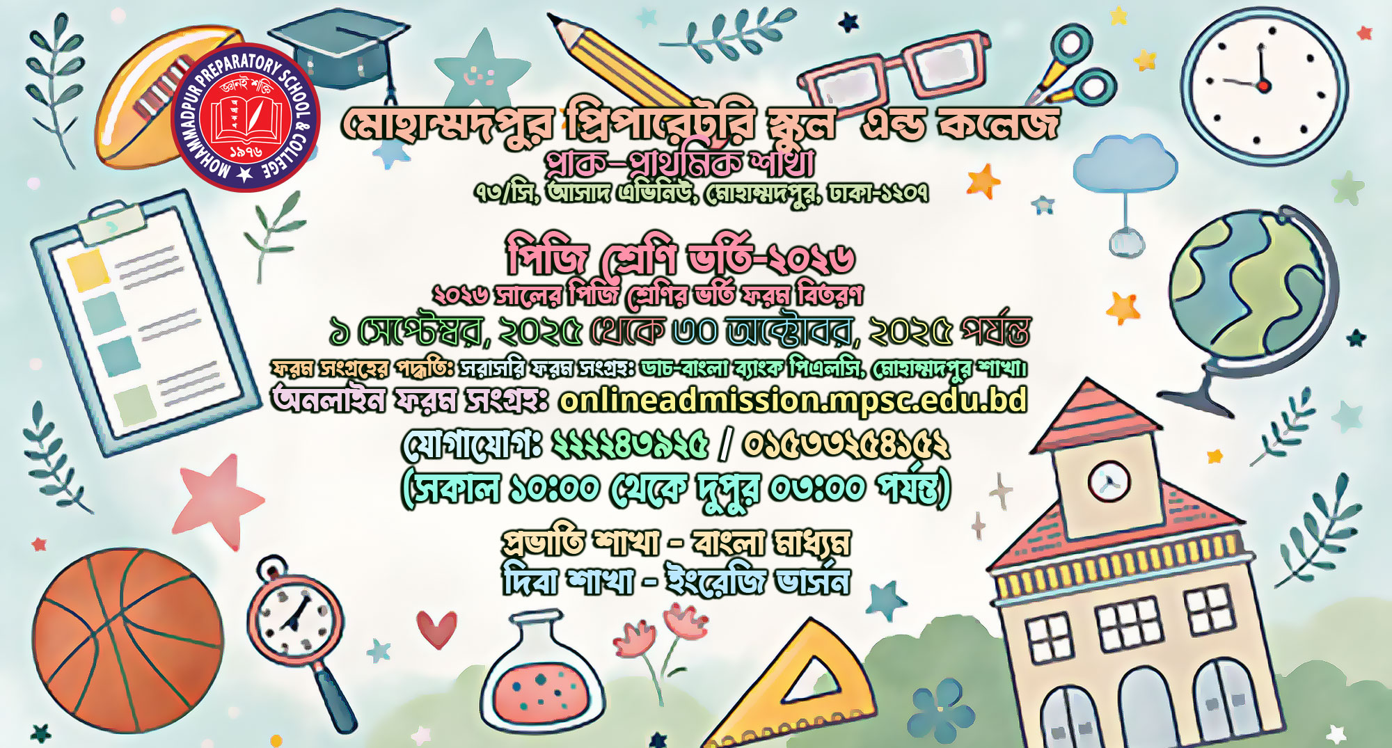 Mohammadpur Preparatory School Admission Circular 2026. MPSC Play Group Admission Result 2026. Mohammadpur Preparatory School and College PG, Play Group, Class one, two, three, four, six and nine Admission test circular 2026. Mohammadpur Preparatory School & College HSC Admission Circular 2025-26. MPSC Class 1 to Class 9 Admission application submission last date October 30, 2025. MPHSS has published admission notice for Boys & Girls students in day and morning shift for Bangla and English version. Limited seat is available for admission in various classes.