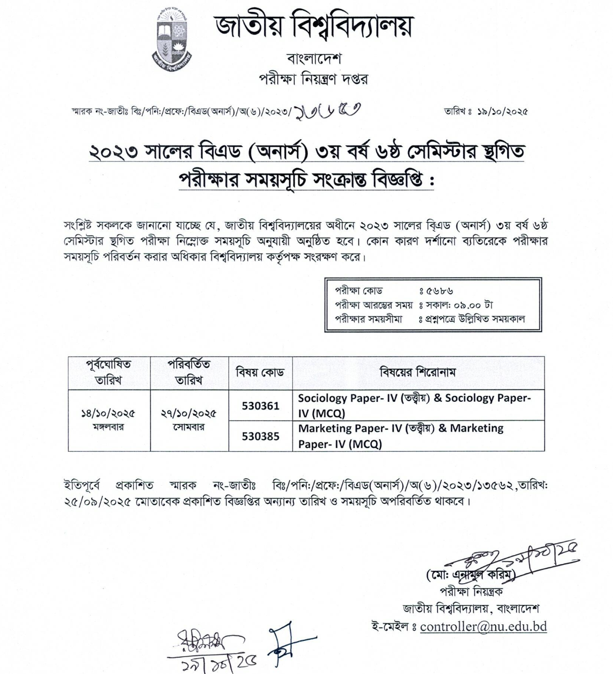 NU B.Ed and B.M.Ed 1st Semester Exam Revised Routine 2025