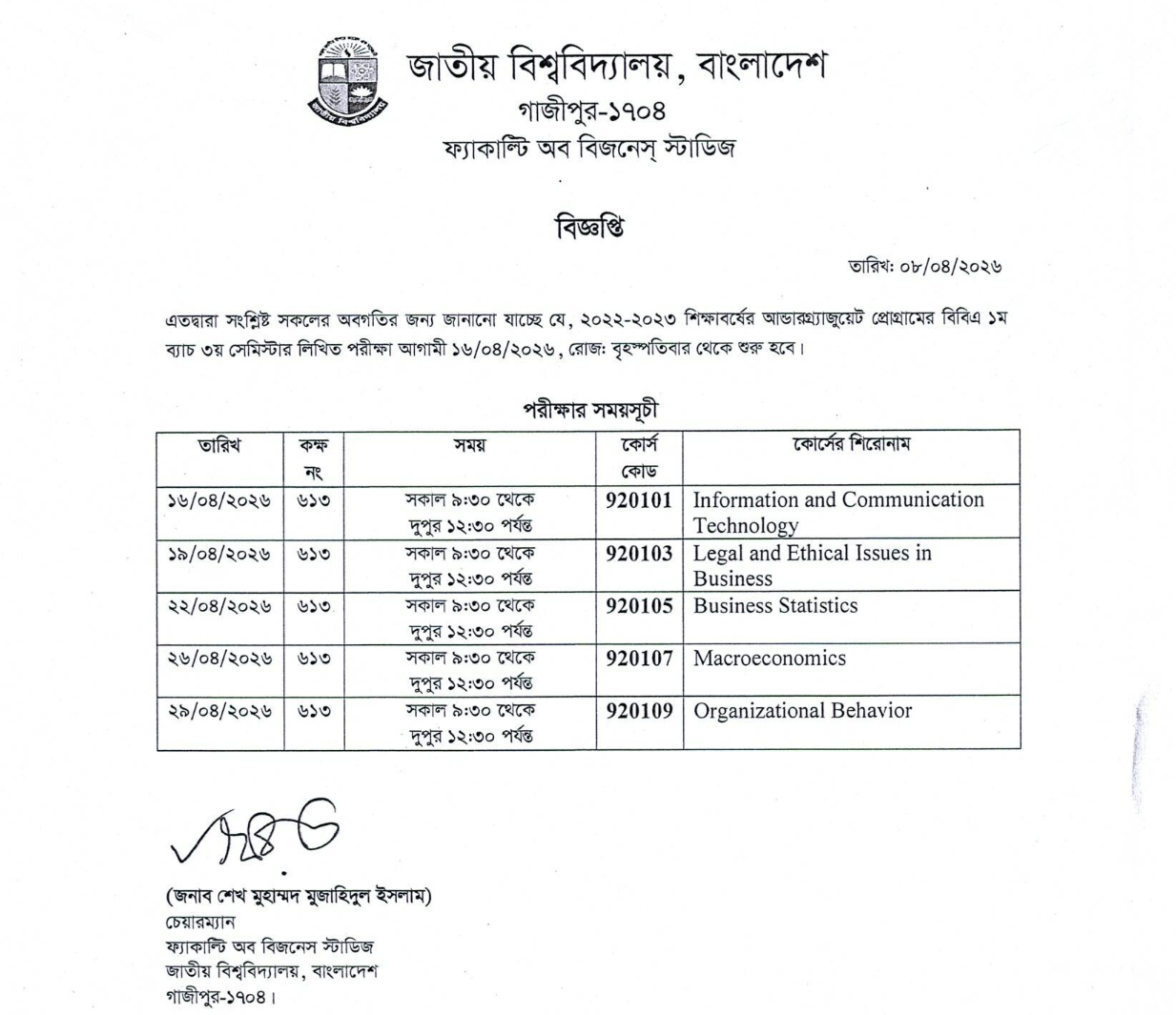 National University BBA 1st Year 1st Semester Exam Routine 2022