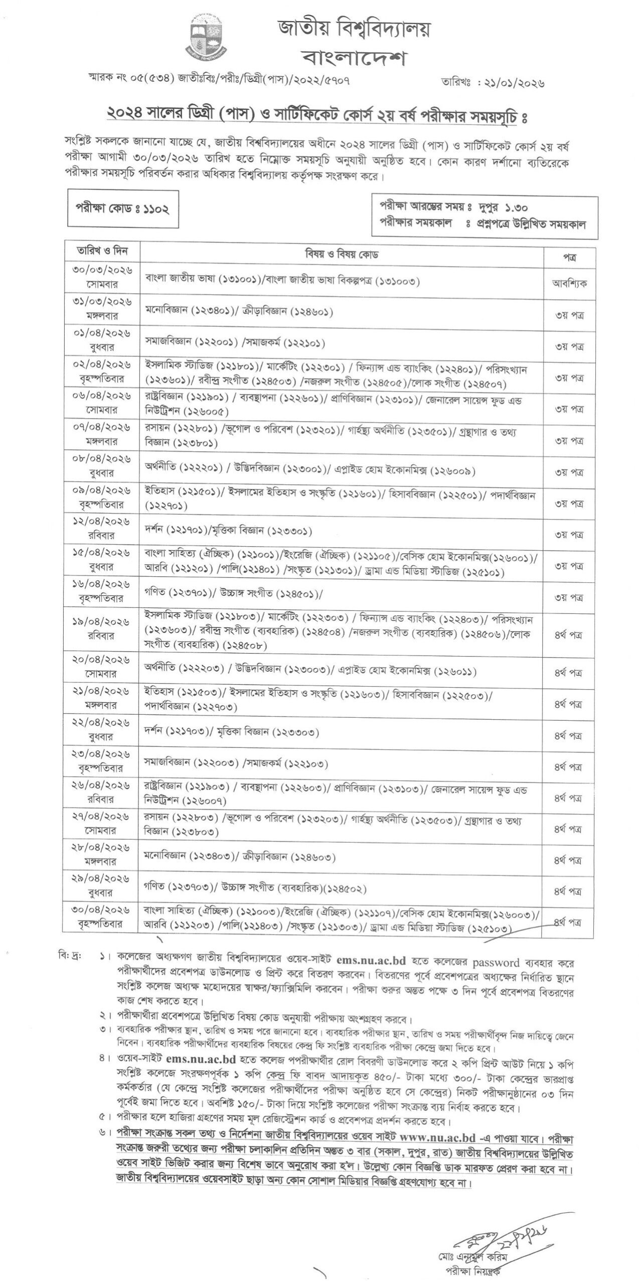 National University Degree Exam Routine 2026 NU