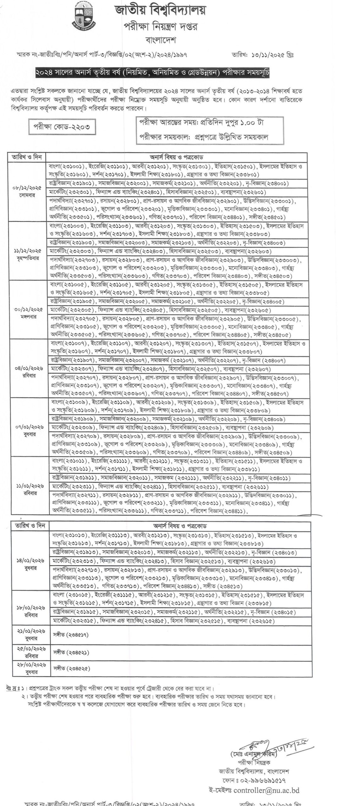 NU Honours 3rd Year Exam Routine 2025 Session 2024