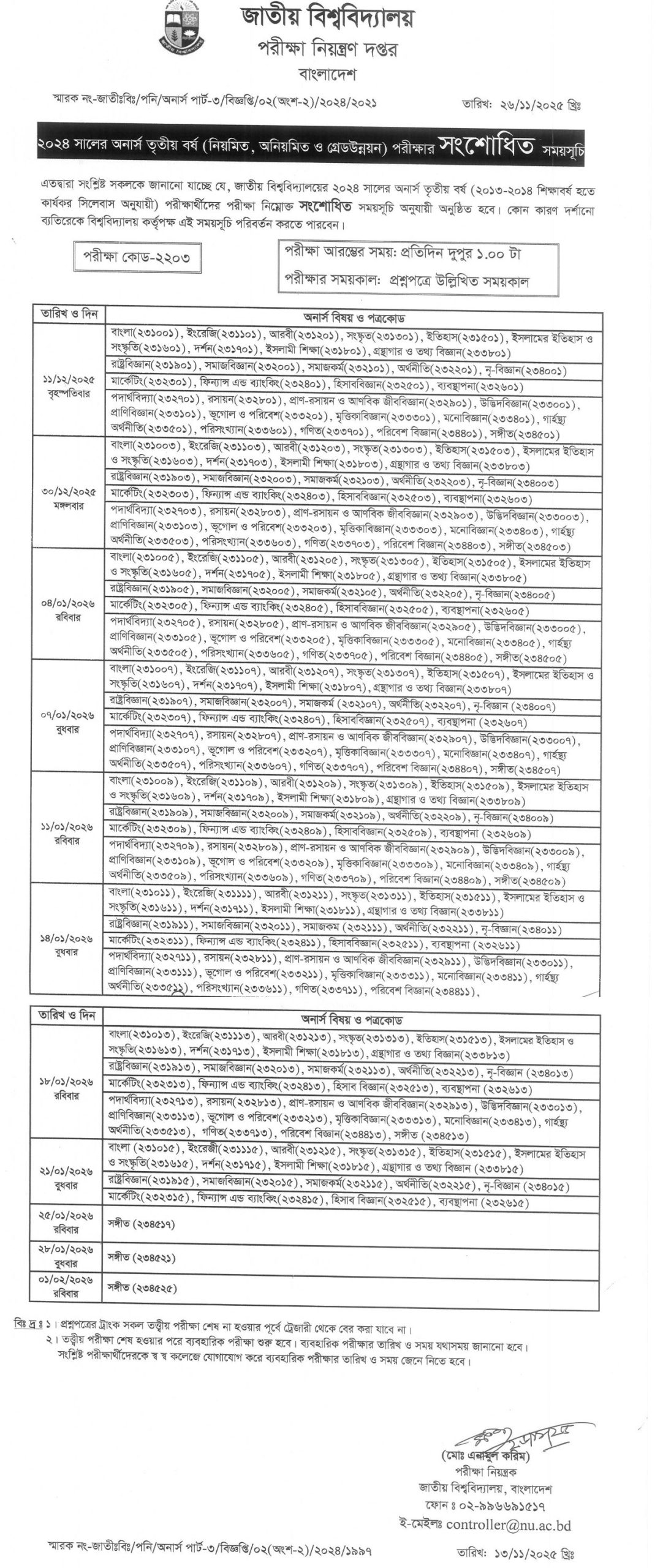 NU National University Honours 3rd Year Exam Revised Routine 2022
