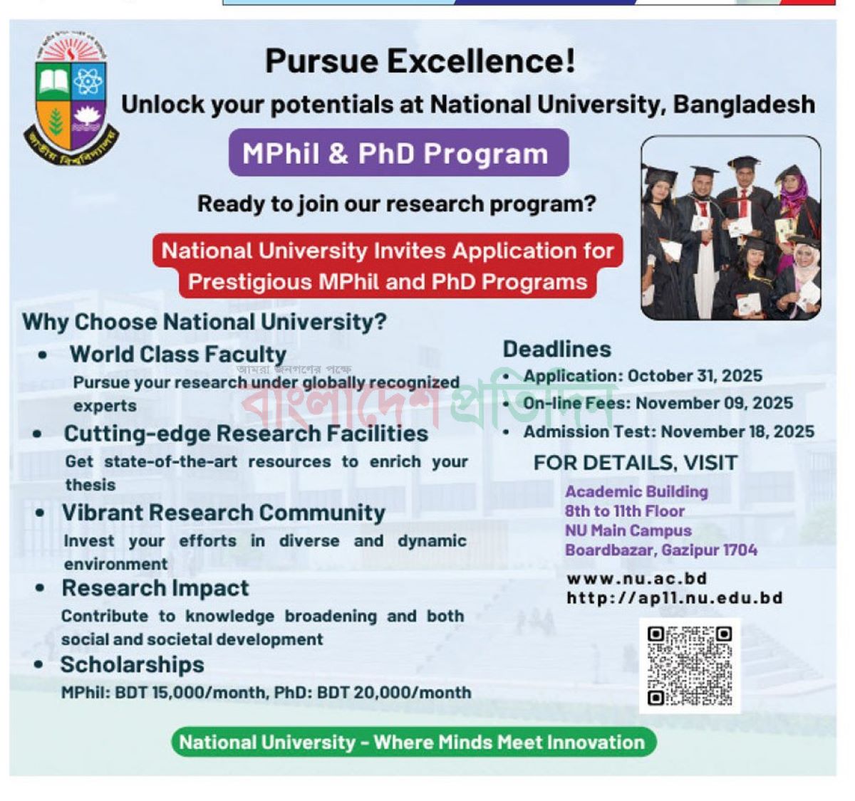 National University M.Phil & PhD Admission Circular 2025-26. National University M.Phil Admission Circular 2025. M.Phil & PhD Admission Result 2025. NU M.Phil and PhD Admission Application submission last date October 21, 2025. M.Phil & PhD Admission Result will publish on August 12, 2024. National University asked full time researcher program admission application for session 2024-25. Applicants have to apply online by www.nu.edu.bd site. NU M.Phil/PhD admission test/viva will be held on August 18, 2024