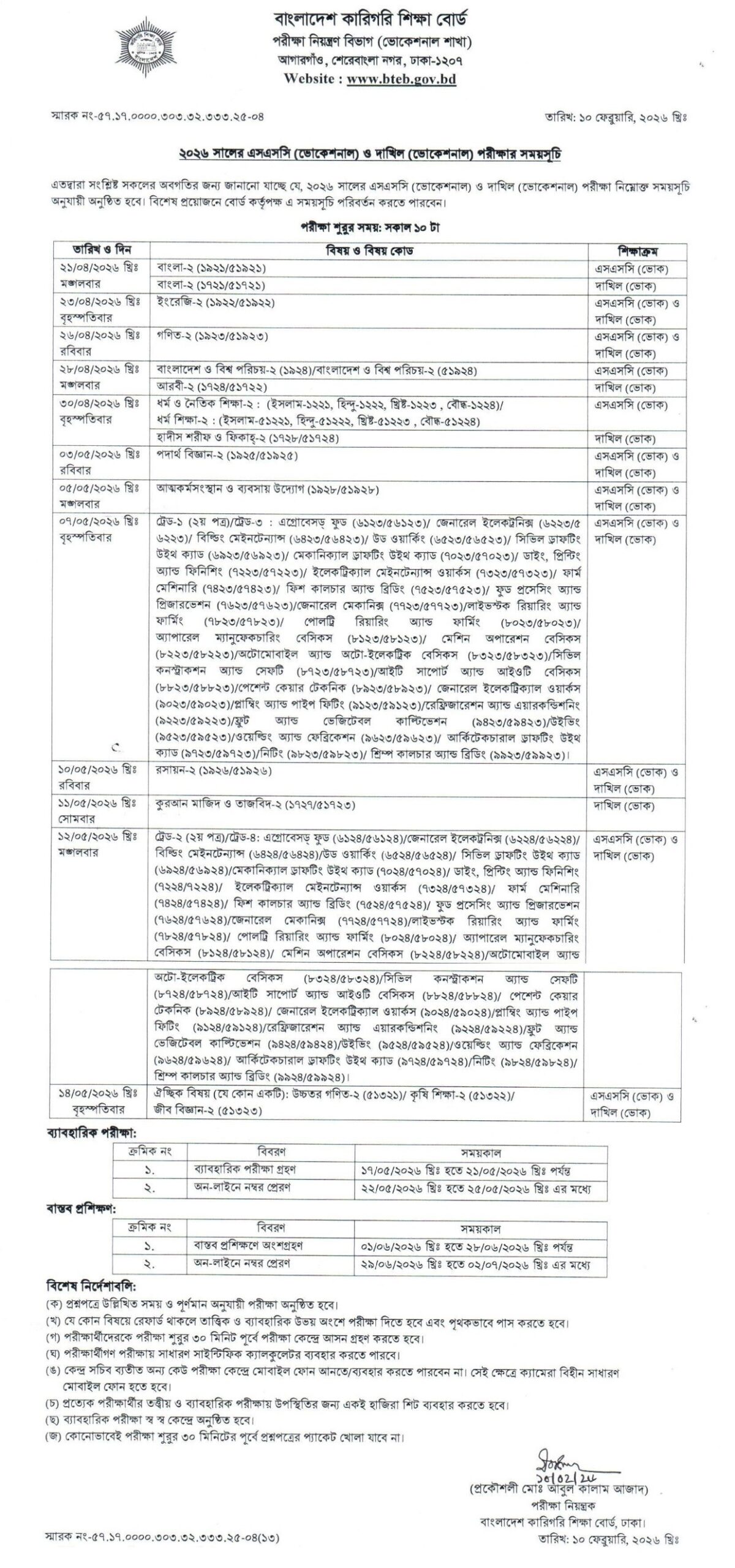 BTEB SSC and Dakhil Vocational Exam Routine 2026
