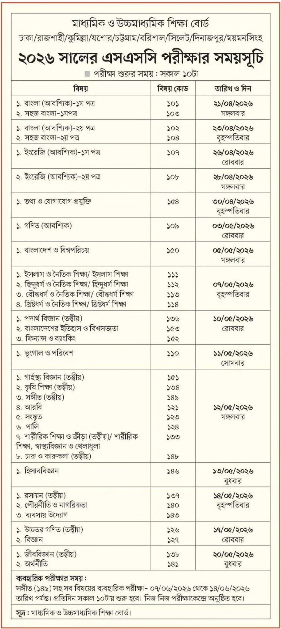SSC Exam Routine 2026. SSC Exam 2026 Routine pdf download. Dhaka Board SSC Routine 2026. SSC Exam date 2026 Bangladesh. SSC Marks Distribution. Download SSC Routine and short syllabus Bangladesh education Board pdf file. Dhaka Board SSC exam form fill up notice published. SSC Exam will be started on 10th April, 2025. Secondary School Certificate Exam date schedule 2025 has published. Dhaka Board, Chittagong Board, Jessore Board SSC Routine 2025. Exam will be started on April 24, 2026 and Theory exam will be completed on 20th May, 2026. SSC Vocational Exam Routine has published under Bangladesh Technical Education Board.